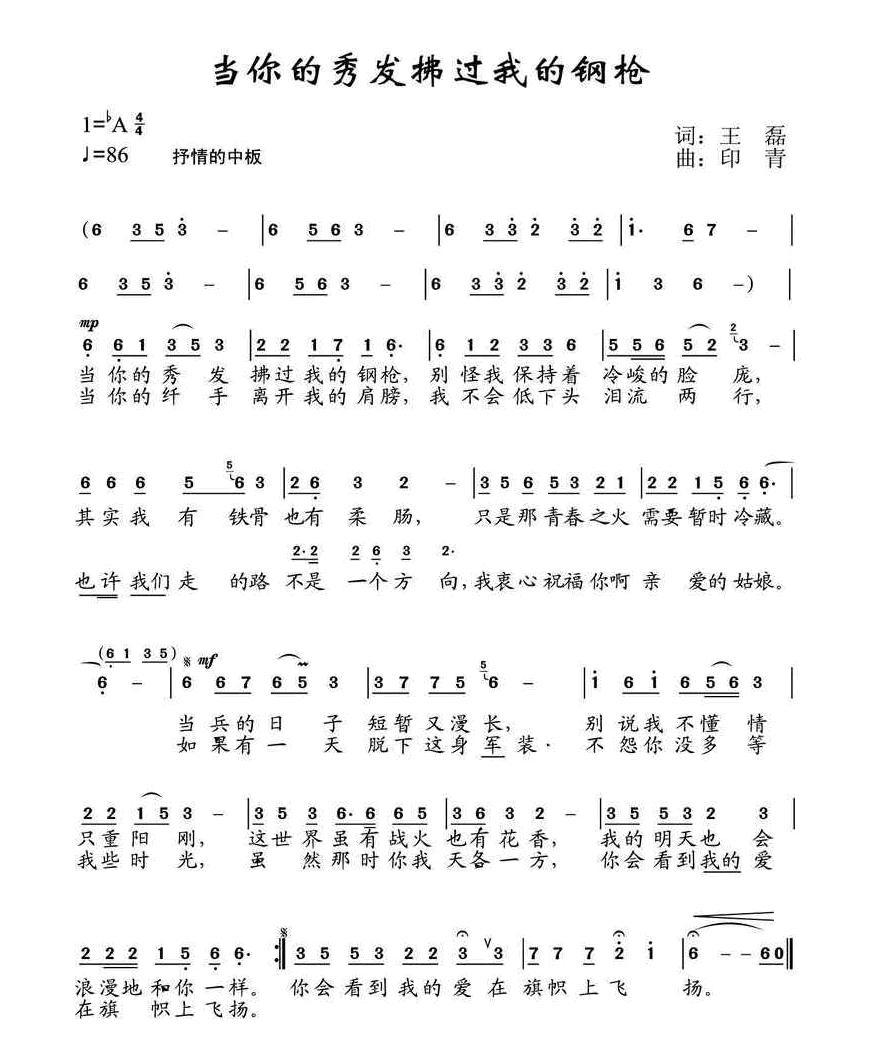 1997年底,《陆海空》专辑正式出版,《当你的秀发拂过我的钢枪》逐渐出现于部队、官兵的手中耳中。虽然我拿到的只是20盘盒带和一张打榜CD,而没有一分钱稿酬,我的心里依然满足。我感到,战士们能唱我这首歌,能喜欢它,我的创作就有价值,就没有白干。很快这首歌在我们学院迅速流传开来,我也被不少女生所注意,在背后议论,但是——当你的秀发拂过我的钢枪,别怪我仍保持着冷峻脸庞,我的情感依然寂寞。