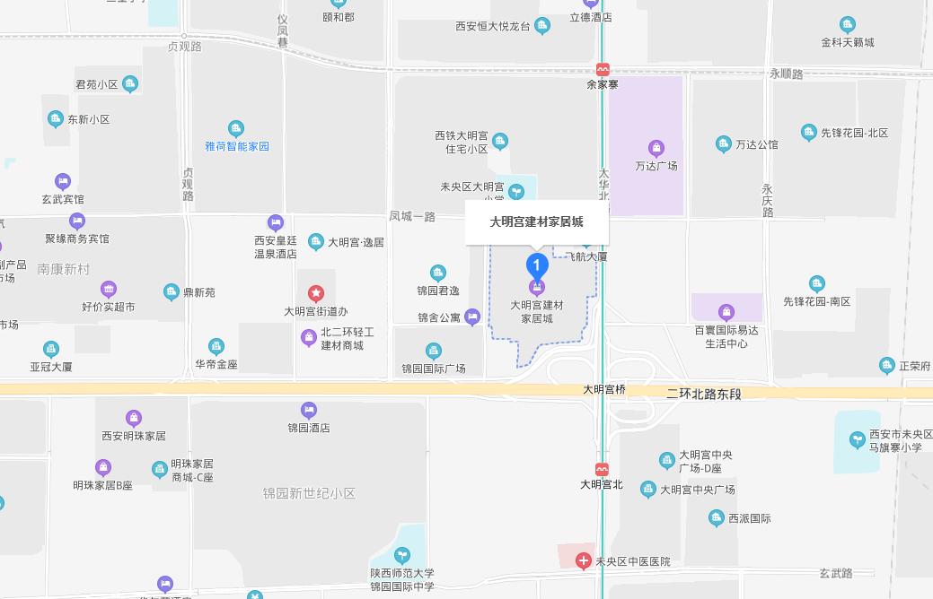 西安大明宫家居城分两个,分别位于北二环,和含光南路。