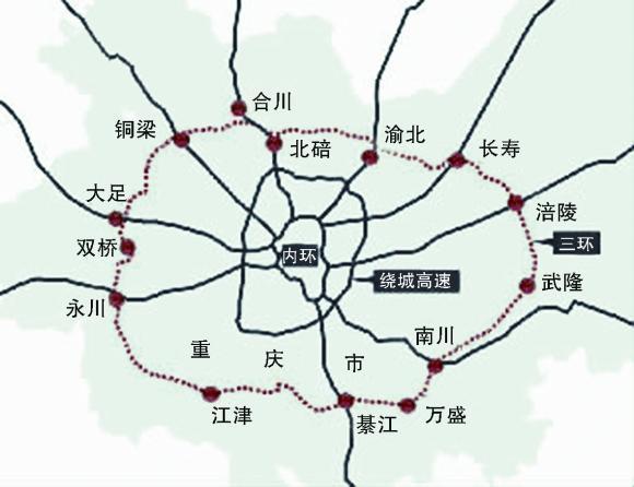 三环高速公路线路以重庆渝北区为起点沿逆时针方向依次:渝北、北碚、合川、铜梁、大足、永川、江津、綦江、南川、武隆、涪陵、长寿、渝北。该线路建成后将重庆“一小时经济圈”囊括。