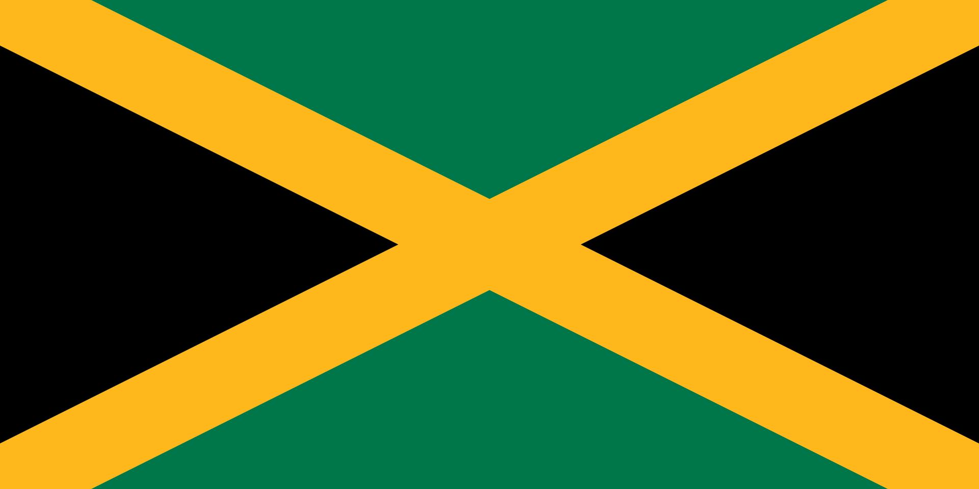 牙买加国旗启用于1962年8月6日,国旗呈长方形,长宽之比为2:1。旗面上有两道交叉的黄色对角宽带,把旗面分成四个三角形,上下为绿色,左右为黑色。黄色代表该国的自然资源和阳光,黑色象征已经克服和即将面临的困难,绿色象征希望和国家丰富的农业资源。