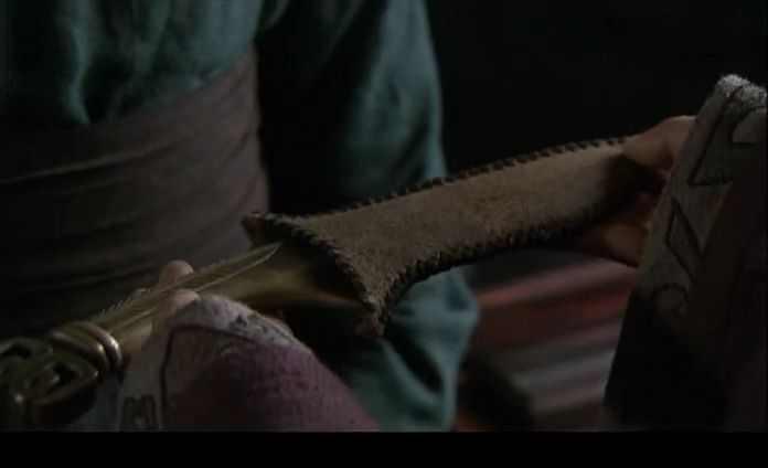 董卓把玩着手中的七宝刀,缓缓说:“无事,是曹操来献七宝刀。”