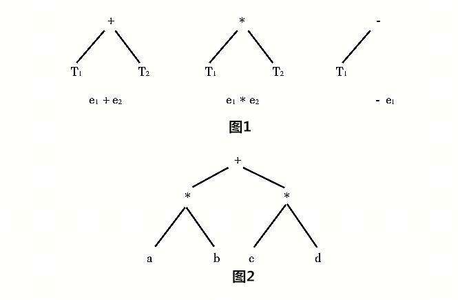 e和e的树分别为T和T,那么e+e,e* e,-e的树分别为图1,表达式a* b+c* d树形表示为图2,后序遍历上述二叉树便可得到该表达式的逆波兰表示ab*cd*+。