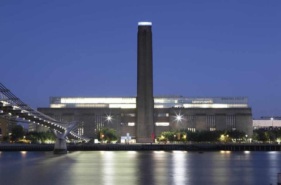 该馆现在是伦敦最受欢迎的美术馆之一,它位于泰晤士河南岸,与圣保罗大教堂隔岸相望,连接它们的是横跨泰晤士河的千禧大桥。外表由褐色砖墙覆盖、内部是钢筋结构的美术馆原本是一座气势宏大的发电厂,高耸入云的大烟囱是它的标志。今天的泰特现代美术馆由瑞士两名年轻的建筑家Jacqes Herzog和 Pierre de Meuron改建而成,他们将巨大的涡轮车间改造成既可举行小型聚会、摆放艺术品,又具有主要通道和集散地功能的大厅,观众从这里乘扶梯上楼。他们在主楼顶部加盖两层高的玻璃盒子,不仅为美术馆提供充足的自然光线,还为观众提供罗曼蒂克的咖啡座,人们在这里边喝咖啡边俯瞰伦敦城,欣赏泰晤士美景。在巨大烟囱的顶部,设计师Michael Crage-Martin与Herzog及de Meuron合作,加盖了一个由半透明的薄板制成的顶,因为由瑞士政府出资,所以命名为“瑞士之光”,如今,它已成为伦敦夜景不可缺少的一部分。