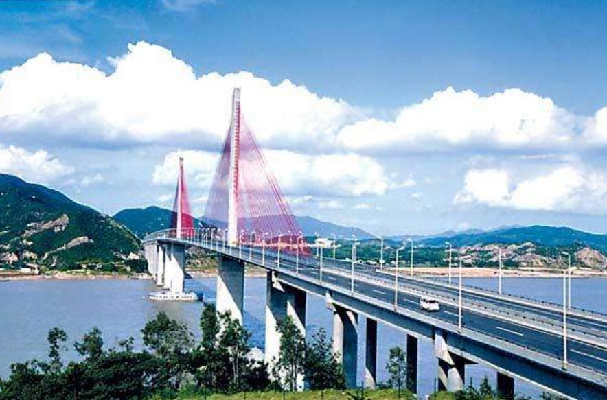 7、主桥选择抗风稳定性好的塔墩梁固结单索面混凝土斜拉桥体系,主跨跨径338米,在当时同类型桥梁中,居当时亚洲第一、世界第二。