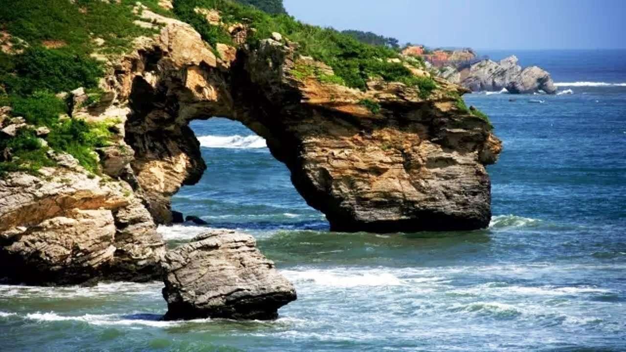 海蚀拱桥在我国辽东半岛沿海时有出现, 著名的锦州笔架山朱家口村海蚀拱桥, 可算是拱桥中的佼佼者了.它是由高5 米、宽约3 米的石英岩组成, 经过泥沙的堆积, 又将岸岛连接在一起, 从岸边到海中的笔架山, 宛若一座海上仙桥, 景色堪称一绝, 故"笔峰奇桥"被列为锦州新八景之一.