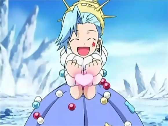 特征:眼睛一直眯着,眼角有一颗红色的小星星,穿蓝色连衣裙,天蓝色头发,头带海螺帽子。
